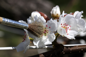 1花づつていねいに筆と鳥の毛を使って雌しべに花粉を付けていきます。